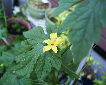 グリーンカーテンとして植えたゴーヤに花が付きました。キュウリやかぼちゃの花とよく似た黄色の花ですが、それよりは小さめで、次から次と咲いています。
